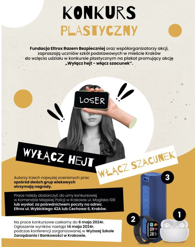 Prace należy dostarczyć do urny konkursowej w Komendzie Miejskiej Policji w Krakowie przy ul. Mogilskiej 109 lub wysłać za pośrednictwem poczty na adres Eltrox ul. Wybickiego 42A lub Cechowa 6, Kraków.