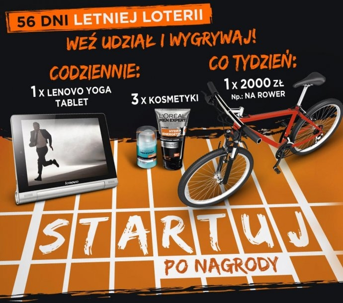 a) I stopnia: Nagrodą Dzienną I stopnia jest Lenovo Yoga Tablet o wartości 830,25zł (słownie: osiemset trzydzieści złotych i 25/100) brutto. Organizator przewidział łącznie 56 (słownie: pięćdziesiąt sześć) Nagród Dziennych I stopnia w Loterii, po 1 Nagrodzie Dziennej I stopnia w każdym losowaniu dziennym;