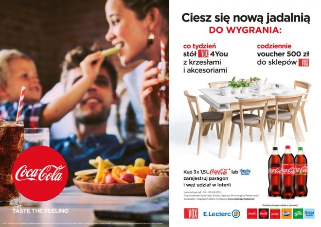Jednorazowy zakup minimum trzech produktów o pojemności 1,5 l spośród następujących marek: Coca-Cola, Coca-Cola Zero Cukru Zero Kalorii, Coca-Cola Lime, Fanta Pomarańczowa, Sprite oraz Kropla Beskidu w dowolnym sklepie sieci E. Leclerc