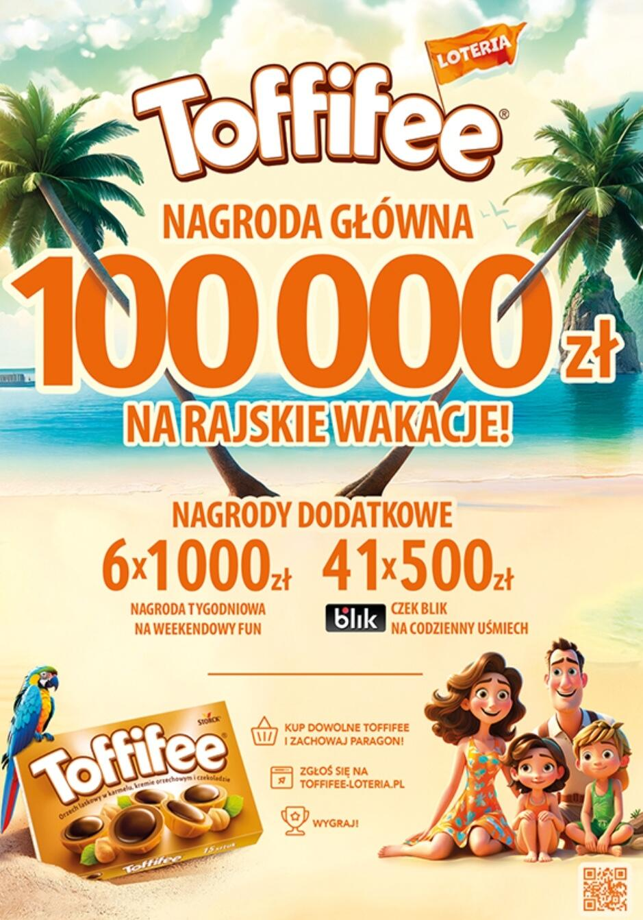 W dniu 07.04.2026 o godz. 8:00 rusza "Loteria Toffifee 2026!", w której można wziąć udział do 17.05.2026 r. do końca dnia!Aby to zrobić trzeba w czasie trwania loterii dokonać zakupu dowolnego produktu marki Toffifee oraz zachować dowód zakupu.
