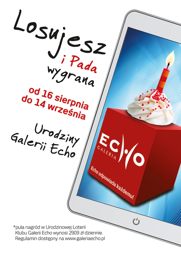 w Loterii jest posiadanie aktywnej Karty Klubu Galerii Echo oraz rejestracja na tę kartę w okresie trwania Loterii co najmniej jednego zakupu o wartości większej lub równej 20 zł.