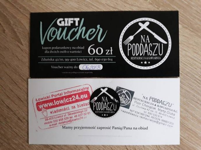 vouchery o wartości 60 złotych do wykorzystania w restauracji Na Poddaszu, mieszczącej się przy ul. Zduńskiej 42/10 w Łowiczu