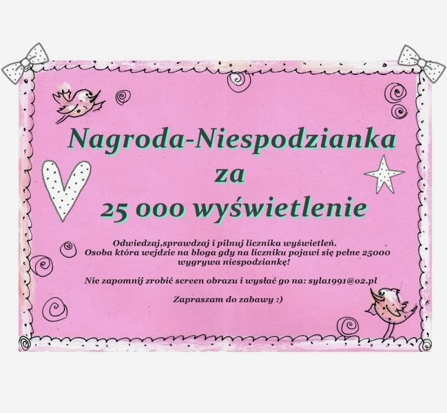 Nagrodzę osobę, która wejdzie na bloga w momencie gdy na liczniku wyświetleń pojawi się pełniutkie 25000 oraz zrobi screen obrazu.