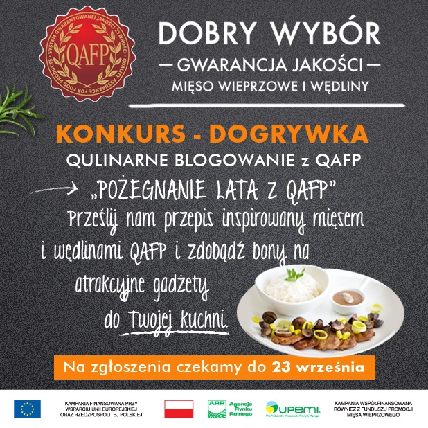 Nadal masz szansę wziąć udział w wyjątkowym "Qulinarnym blogowaniu z QAFP". 1 września rusza dogrywka w konkursie dla blogerów kulinarnych. Tematem przewodnim jest "Pożegnanie lata z QAFP". Autor najbardziej pomysłowego i ciekawego przepisu zawierającego w składzie mięso lub wędliny QAFP otrzyma nagrodę główną – kartę upominkową na zakup akcesoriów kuchennych. Konkurs organizowany jest w ramach kampanii "Gwarancja Jakości QAFP".