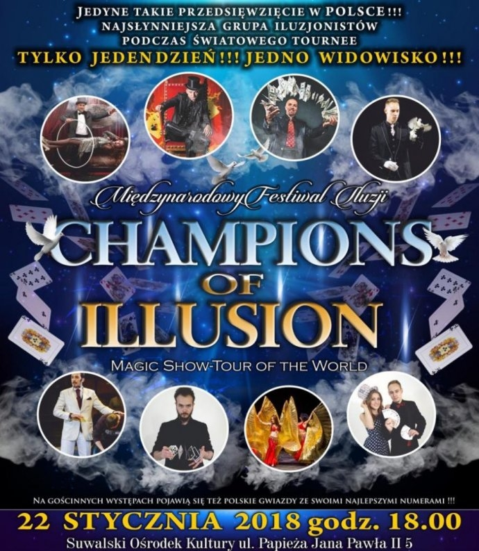 podwójną wejściówkę na Międzynarodowy Festiwal Iluzji Champions of Illusion z programem „Magic Show - tour of the World”, który odbędzie się 22 stycznia, w Suwalskim Ośrodku Kultury.