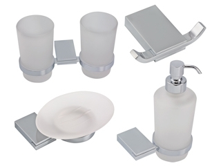 zestaw akcesoriów łazienkowych Novatorre 9. W skład zestawu wchodzi: dozownik na mydło ścienny, szklanka podwójna, wieszak podwójny oraz mydelniczka szklana.