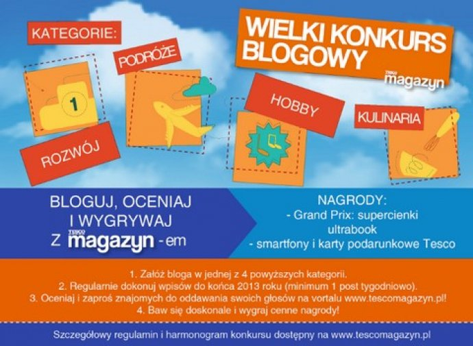 Blogi są nie tylko modne, dla niektórych to również sposób na życie. Aby zachęcić Was do dzielenia się swoimi pasjami, przygotowaliśmy konkurs. Aby wziąć w nim udział, należy założyć bloga na ogólnopolskiej platformie blogowej w okresie od 1 do 30 czerwca 2013 r. w jednej z czterech kategorii: podróże, kulinaria, rozwój osobisty i zawodowy lub hobby i zainteresowania.