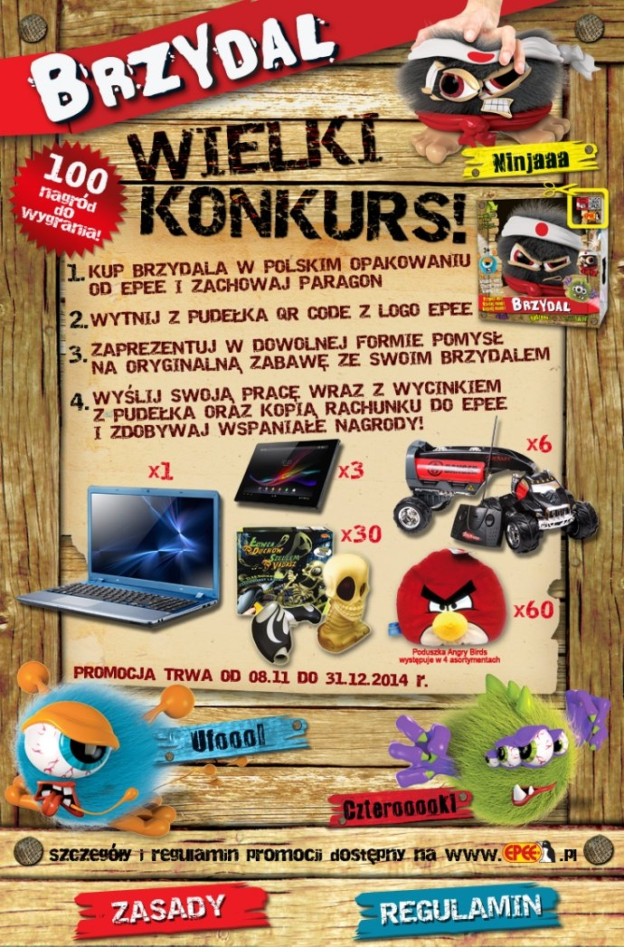 Warunkiem uczestnictwa w konkursie jest zakupienie w dniach od 10.11.2014 r. do 31.12.2014 r. zabawki Brzydal od Epee Polska, wysłanie kopii paragonu potwierdzającego zakup zabawki wraz z wycinkiem z pudełka QR Code i loga Epee oraz pracą konkursową (zaprezentowaną w dowolnej formie, tj. zdjęcia, filmu, rysunku itp.) na adres: Epee Polska ul. Jagiellońska 29a, 70-365 Szczecin.