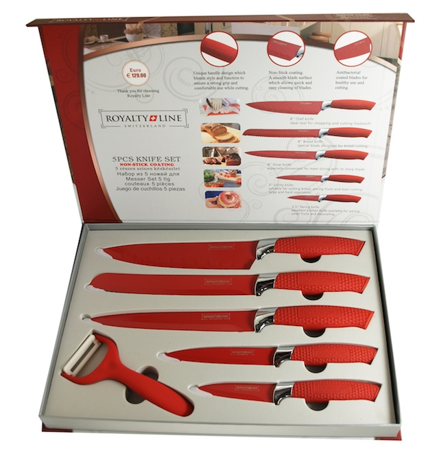 4 zestawy noży Royalty Line Switzerland od marki Rolnik. (Jeden zestaw składa się z pięciu noży kuchennych oraz obieraka do warzyw)