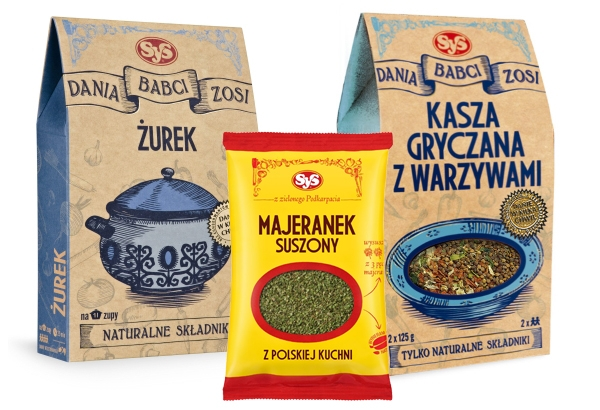 zestawy produktów firmy SyS: żurek z serii Dania Babci Zosi, majeranek suszony – idealna przyprawa do świątecznych dań, kasza gryczana z warzywami z serii Dania Babci Zosi.