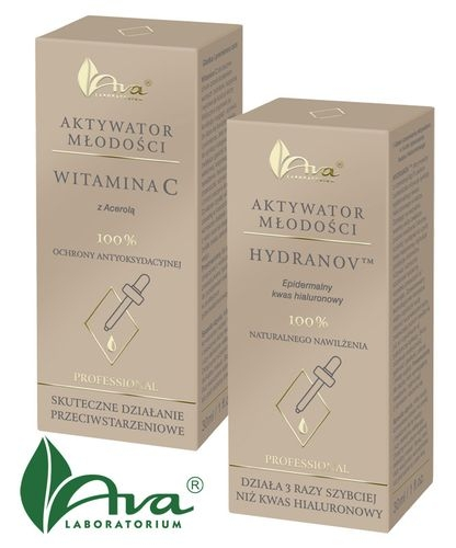 3 zestawy kosmetyków, w każdym zestawie są dwa kosmetyki z serii Aktywatory Młodości od firmy Ava: Hydranov (intensywnie nawilżający preparat z kwasu hialuronowego) i Witamina C (skoncentrowana siła witaminy C z acerolą).