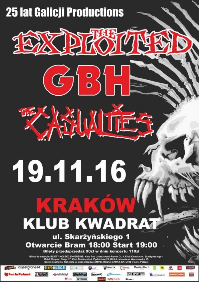 6 pojedynczych wejściówek na koncert The Exploited, GBH i The Casualties w Krakowie, który odbędzie się 19 listopada 2016 w klubie Kwadrat w Krakowie.