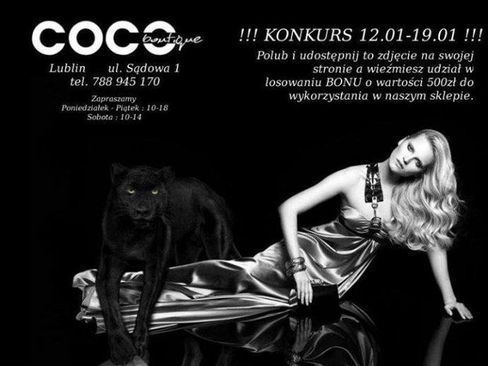 Zapraszamy do udziału w naszym konkursie. Wśród wszystkich, którzy polubią i udostępnią to zdjęcie rozlosujemy jedną osobę która otrzyma Bon o wartości 500zł na zakupy w COCO Boutique Lublin