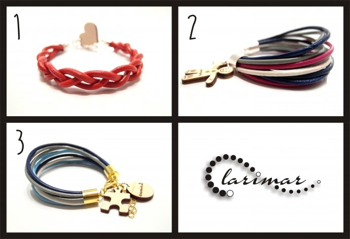 3 bransoletki z drewnianymi zawieszkami zaprojektowanymi przez Larimar.