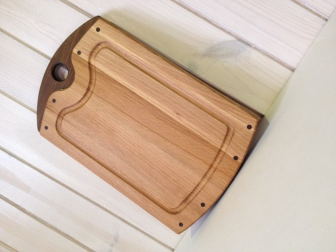 deska do krojenia zrobiona z drewna bukowego i orzecha amerykańskiego o wymiarach ca. 20cm x 32cm x 2,4cm