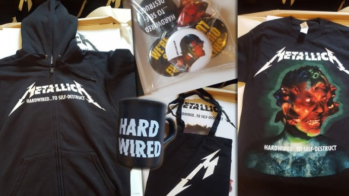 zestaw gadżetów zespołu składający się z bluzy, koszulki, torby płóciennej, zestawu badgów oraz kubka.