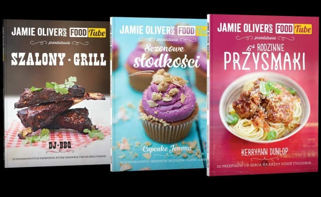pakiet książek "Jamie Oliver's FoodTube" w skład których wchodzą trzy pozycje: "Rodzinne przysmaki", "Sezonowe słodkości" i "Szalony grill"