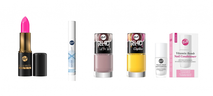 5 zestawów kosmetyków Bell (pomadka do ust Celebrity + lakier do paznokci Gel 4D Caffe Latte + lakier do paznokci Gel 4D Confiture + odżywka do paznokci Vitamin Bomb +Water Extreme Top Coat)