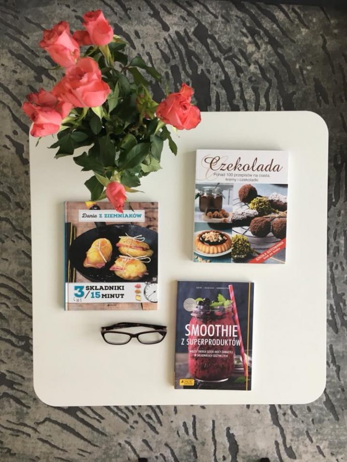 3 książki kulinarne od wydawnictwa Jedność: czekolada, smoothie i ziemniaki.