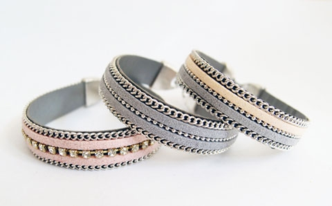 3 zestawy pięknych pastelowych bransoletek Lolimi (w każdym zestawie aż 3 bransoletki), wykonanych ze skóry, w kolorach bladoróżowym, szarym i kremowym