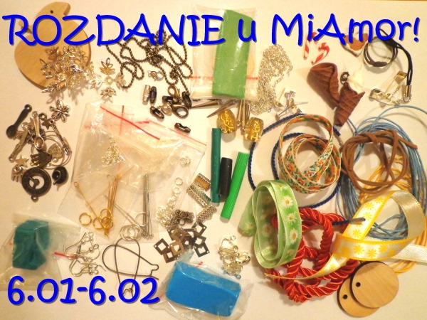 Półfabrykaty do tworzenia biżuterii - sznurki, wstążki, bigle, ogniwka, bazy pierścionków, serwetki do decoupage, zawieszki, modelina itp oraz kilka elementów wykonanych przeze mnie. Pełny opis nagrody na blogu.