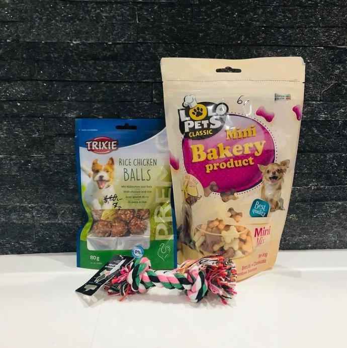 Zestaw dla psa, który składa się z przekąsek oraz gryzaka.