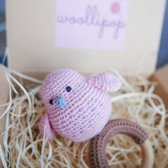 Ręcznie wykonana, szydełkowa grzechotka marki Woollipop idealna jako element wyprawki lub oryginalny prezent dla niemowlaka