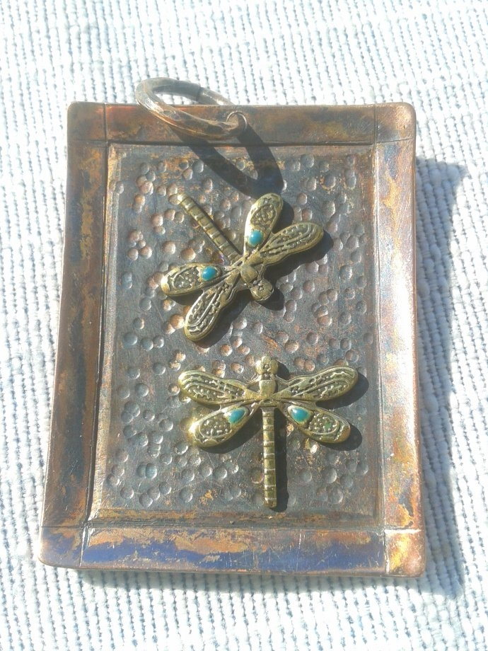 ręcznie wykonana miedziana zawieszka z dwiema kolorowymi ważkami