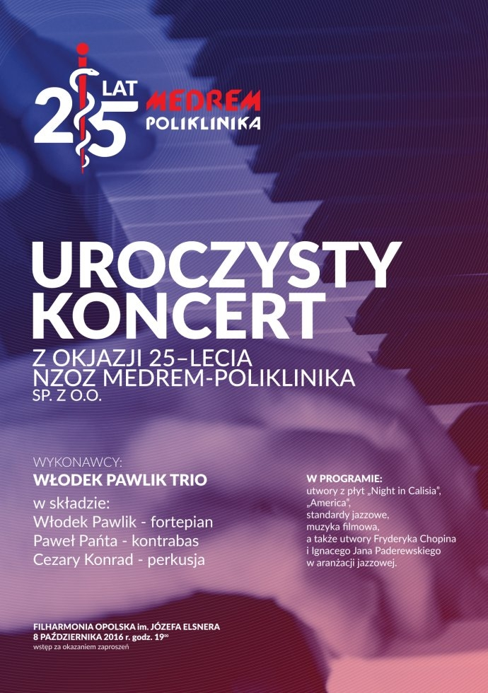 Mija 25 lat od założenia w Opolu pierwszej w regionie i jednej z pierwszych w kraju prywatnej, wielospecjalistycznej przychodni lekarskiej – Medrem-Poliklinika. Z tej okazji w najbliższą sobotę (08.10) w Filharmonii Opolskiej odbędzie się uroczysty koncert, na którym wystąpi światowej sławy pianista jazzowy Włodek Pawlik, laureat prestiżowej nagrody muzycznej Grammy. Początek o godz. 19:00. Wstęp na koncert wymaga zaproszeń. 10 takich podwójnych zaproszeń będziemy mieć dla naszych słuchaczy. Będą do zdobycia od środy (05.10) do piątku (07.10) podczas audycji „Ona i On”.