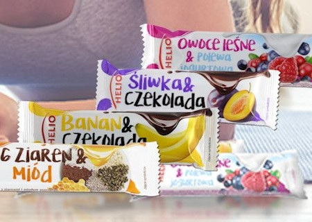 3 zestawy batonów zbożowych Helio. W skład każdego zestawu wchodzi: