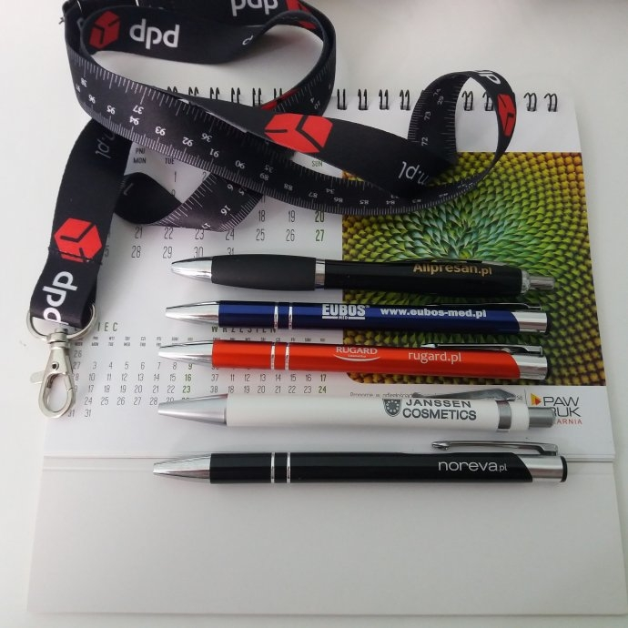 - Pięć długopisów reklamowych firm kosmetycznych.