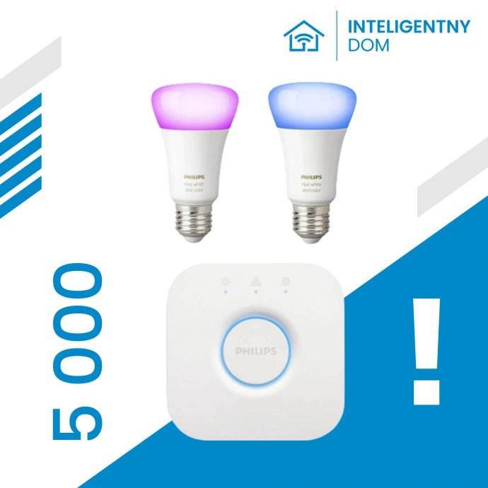 kompletny zestaw inteligentnego oświetlenia: 2 żarówki E27 LED RGBW (dowolny zakres kolorów i światła białego) Philips Hue + mostek