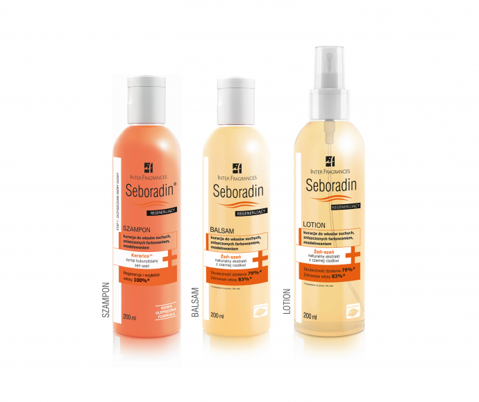 trzy zestawy kosmetyków do włosów Seboradin (w skład każdego z nich wchodzi: Szampon Seboradin Regenerujący, Lotion Seboradin Regenerujący, Balsam Seboradin Regenerujący)