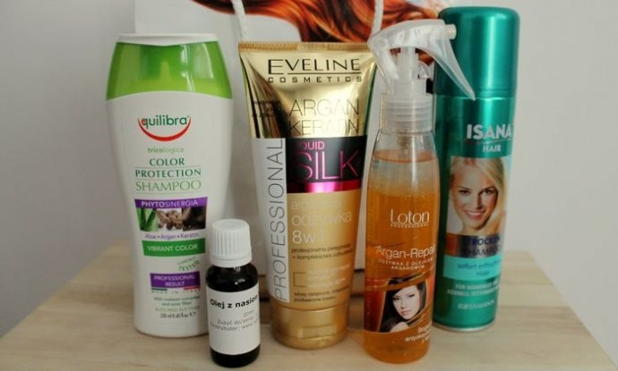 zestaw do pielęgnacji włosów: szampon do włosów farbowanych Equilibra z bardzo dobrym, naturalnym składem; odżywka arganowa Eveline; olej z nasion malin (do olejowania, końcówek, chroni również przed UV), odżywka arganowa w sprayu Loton, suchy szampon Isana.