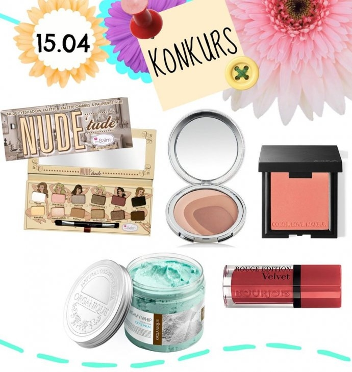 zestaw kosmetyków w skład których wchodzi: paletka cieni TheBalm NUDE'tude, róż do policzków Zoeva, trójkolorowy puder brązujący Kiko, kolonialna pianka do mycia ciała Organique, matowa pomadka Bourjois Rouge Edition