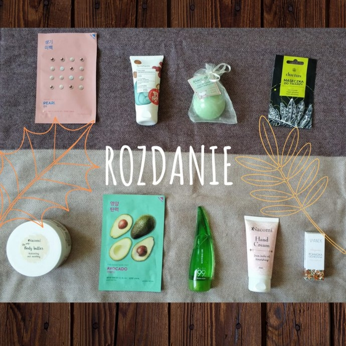 Nacomi: Body Butter, Hand Cream, półkula do kąpieli Zielona Herbata; Holika Holika: Aloe Gel, maska Avocado i Pearl; Vis Plantis Peeling Drobnoziarnisty; Duetus Maseczka; Vianek Pomadka Ochronna