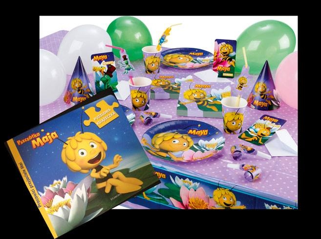 5 zestawów urodzinowych z Pszczółką Mają (kubeczki, talerzyki, świeczki na tort, imprezowe czapeczki na głowę) + świetna książeczka z puzzlami o Mai!