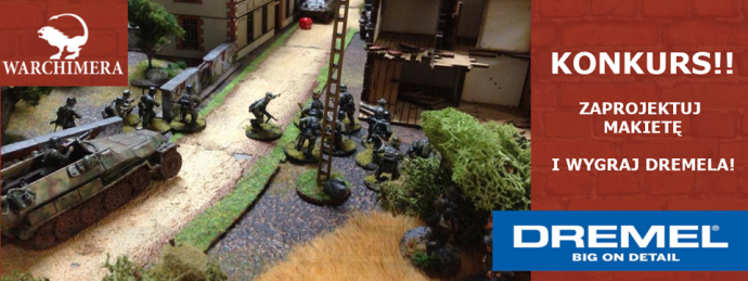 Wraz z firmą Dremel Polska zapraszamy Was do wzięcia udziału w konkursie na makietę terenu do figurkowej gry bitewnej w skali 1:56. Konkurs ma dwa etapy - pierwszy trwa do 8 kwietnia 2015 r., drugi kończy się 30 kwietnia 2015 r. W pierwszym etapie uczestnicy wysyłają projekt makiety. Wśród zgłoszonych prac wybierzemy trzech finalistów, którzy otrzymają zestawy Dremela oraz Linie umocnień Warchimery. W drugim etapie finaliści będą musieli wykonać swój projekt. Najlepsza praca otrzyma nagrodę w postaci zestawu startowego do gry Bolt Action "Assault on Normandy". Dodatkowo wszyscy finaliści dostaną zaproszenie do Muzeum Broni Pancernej w Poznaniu, gdzie będzie czekała na nich niespodzianka Puszczający oczko